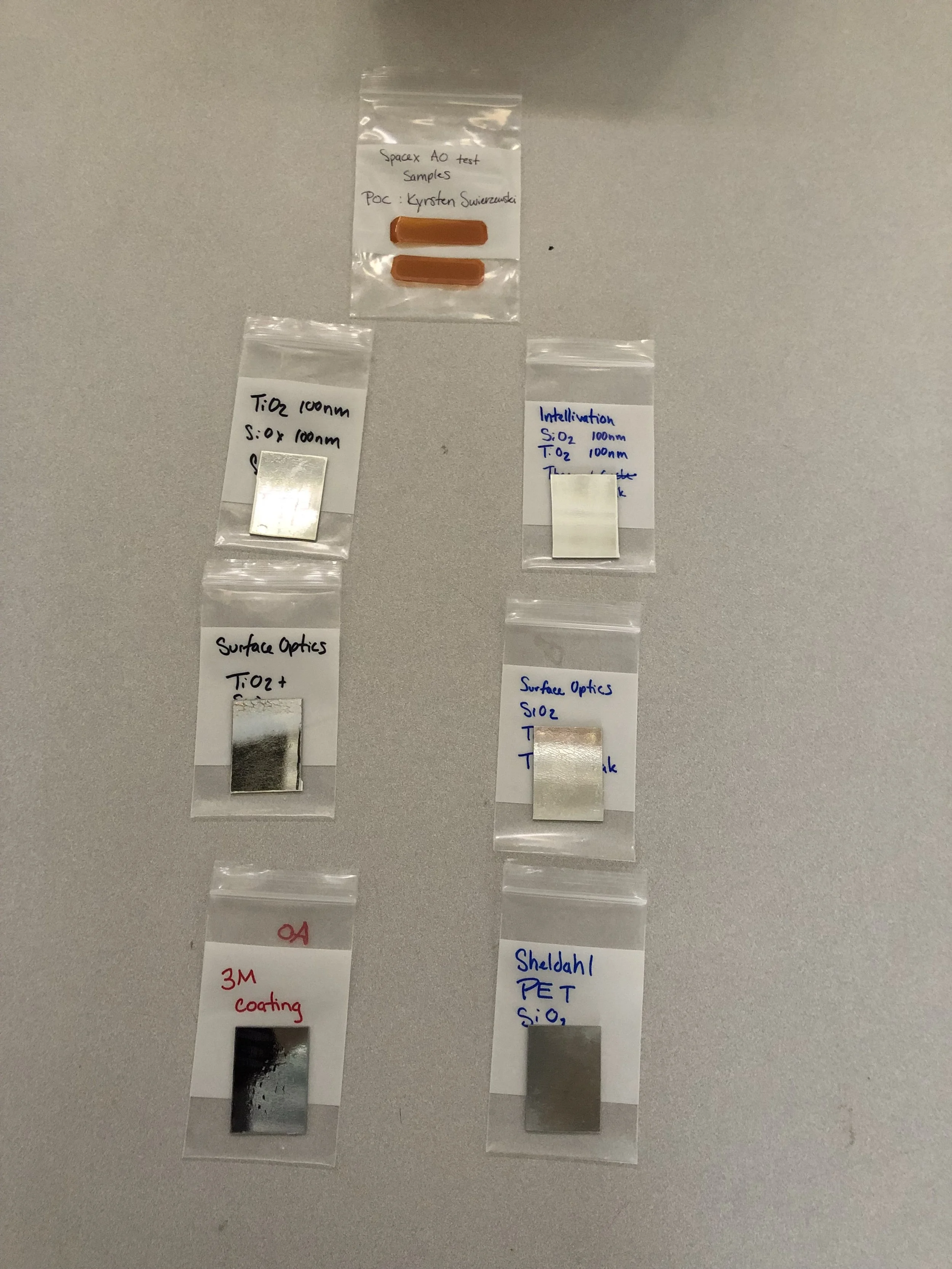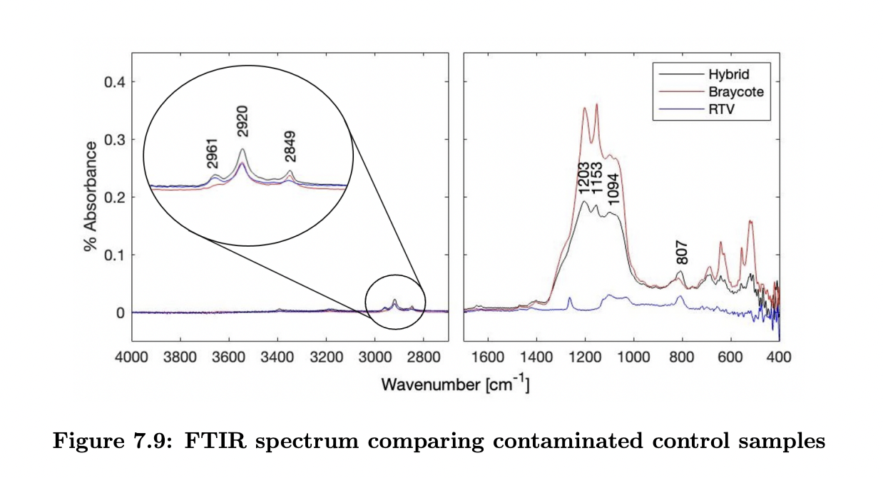 Abstract: “Understanding the space environment and contamination concerns of a spacecraft is critical in designing a successful mission. The ability for a spacecraft to meet its science objectives relies on systems functioning as intended. A concern for maintaining performance while on orbit is molecular contamination. Silicones have previously been shown to form a silica layer on their surfaces when exposed to atomic oxygen. For silicone contamination, this translates to a silica film on the contaminated surface. Missions such as Long Duration Exposure Facility and Evaluation of Oxygen Interactions with Materials III have indicated that the silica film can trap deposits of carbon contamination to the surface during its formation. This phenomenon was explored in this research using RTV-S 691 silicone and Braycote 601EF for the carbon-based contaminant. The experiment involved contaminating an aluminum substrate in three different configurations; one for each contaminant individually on the substrate, and one with both contaminants. These samples were exposed to atomic oxygen for a period of 24 hours, then analyzed with Fourier transform infrared spectroscopy. The trends in infrared spectra for the different test cases were characterized for comparison. The trend for samples with a carbon-to-silicone contamination ratio of greater than ten to one showed peaks corresponding to those seen on the singularly contaminated samples. When the concentration of silicone was increased, the trend in spectral results showed peaks corresponding to Braycote before atomic oxygen exposure. At certain concentrations of RTV silicone to Braycote, the trends suggest Braycote is partially protected from atomic oxygen by a silica film. This indicates that silicone conversion to silica in atomic oxygen can trap contaminants to a surface.”